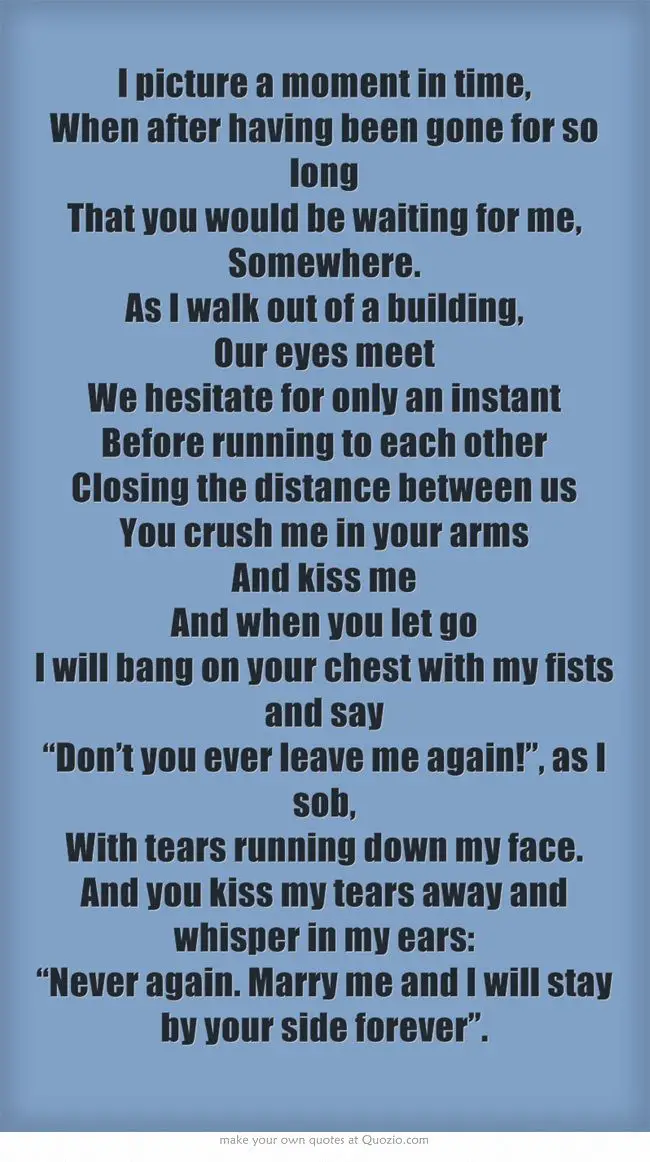 Every bit of me sweetheart weeps when you are not around, instead in tears i find myself deep and drowned. If only desire of it makes you quite mad enough never to tire of it, makes you hold all other things tawdry and cheap for it. Got a bowl of swedish fish and a note that said “of all the fish in the sea, you are the only one for me. You help me let go of my strife. I am simply me my life is fairly bland, but it belongs to me. This poem has realy touched me because it basically speaks of stuff that sometimes some of us go thruogh and we cannot express them by words. When going out for a walk in the park was the super plan and always an excuse. Look for me in rainbows, way up in the sky. 9) there’s so much about. I freeze up like a pole.