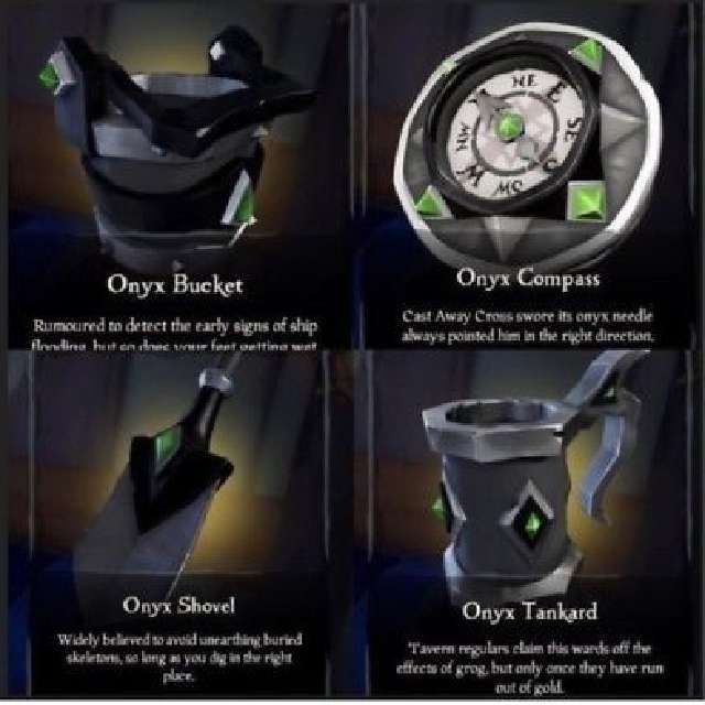 Onyx Bucket, Onyx Compass, Obsidian Drum, And Black Dog Concertina. I Launched My Sea Of Thieves Game And Went To My Equipment Chest.